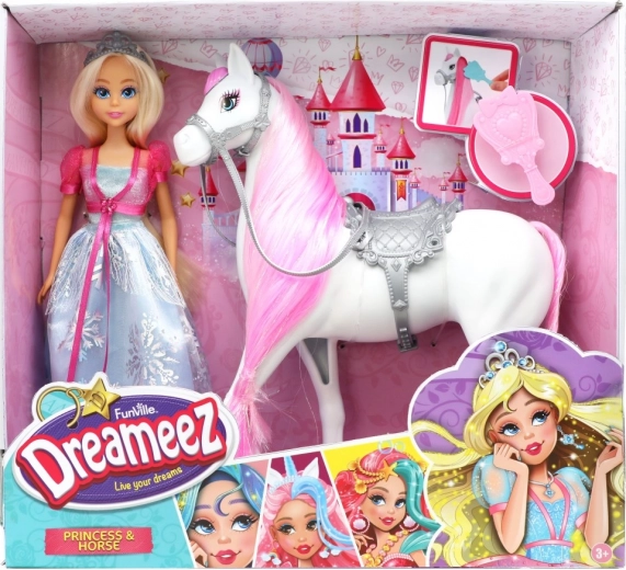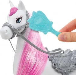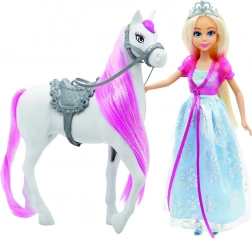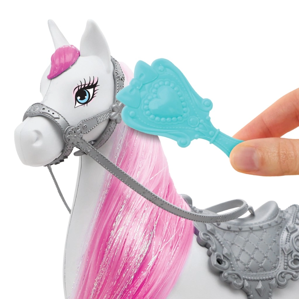 La poupée mesure environ 29 cm, porte une couronne et une robe richement décorée, le cheval est équipé d’une selle et d’une bride. Grâce aux accessoires, le jeu est encore plus réaliste et amusant – des balades aux soins de la crinière.