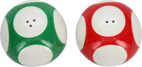 Apportez une touche ludique à votre cuisine avec cet ensemble de salière et poivrier en céramique inspiré de l’univers de Super Mario. La paire de champignons aux couleurs rouge et vert iconiques attire le regard et offre un dosage pratique des épices grâce aux trous situés sur le dessus. Idéal comme cadeau original et comme accessoire de table stylé.