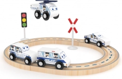 Le set comprend au total 16 pièces, dont des rails et des véhicules de police, faciles à assembler et à étendre avec d’autres sets en bois.