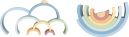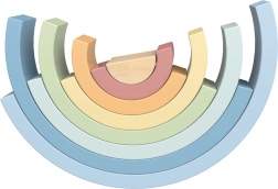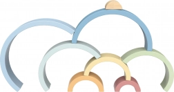 Le set comprend 8 pièces semi‑circulaires de tailles variées et aux teintes douces, à empiler en arc‑en‑ciel, en ponts, en tunnels ou en constructions imaginaires.