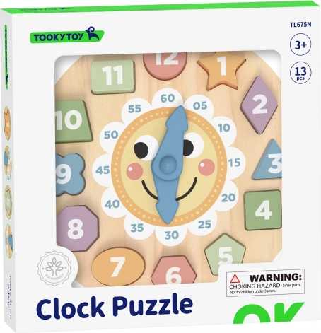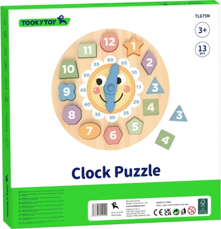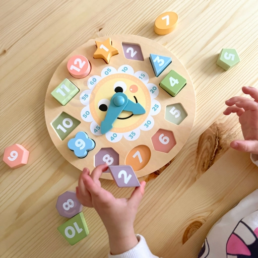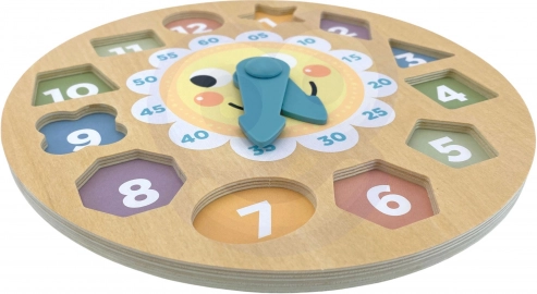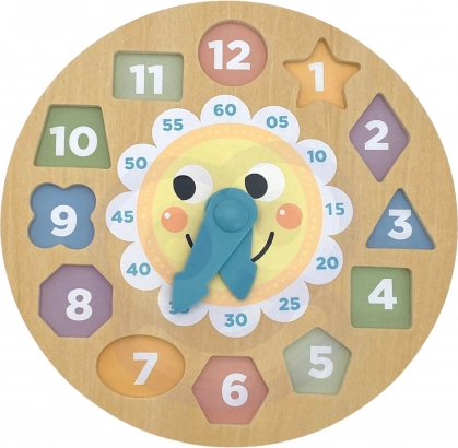 L’horloge éducative en bois TOOKY TOY combine un puzzle d’assemblage de formes avec les premiers pas dans l’apprentissage de l’heure. Douze pièces colorées de formes variées, numérotées de 1 à 12, s’insèrent dans les ouvertures correspondantes, tandis que les aiguilles bleues mobiles invitent à s’exercer aux heures et aux minutes. Un petit soleil souriant au centre et des couleurs pastel agréables encouragent l’exploration et le jeu concentré.