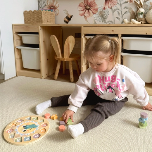 L’horloge développe la motricité fine, les capacités de coordination, la perception visuelle et la pensée logique. Elle est fabriquée en bois lisse et résistant sans arêtes vives, et colorée avec des peintures sûres et non toxiques. Grâce à l’échelle des minutes bien lisible, les enfants apprennent facilement la division de l’heure en minutes et les premières règles de lecture de l’horloge.