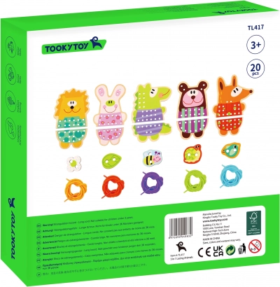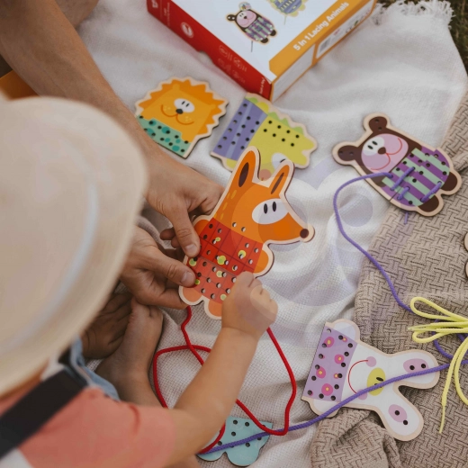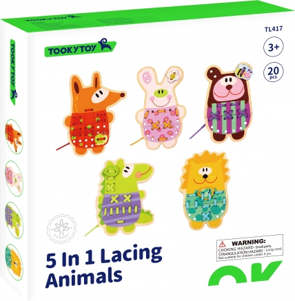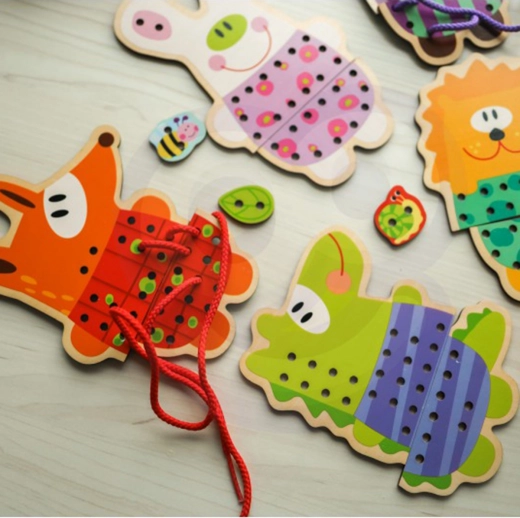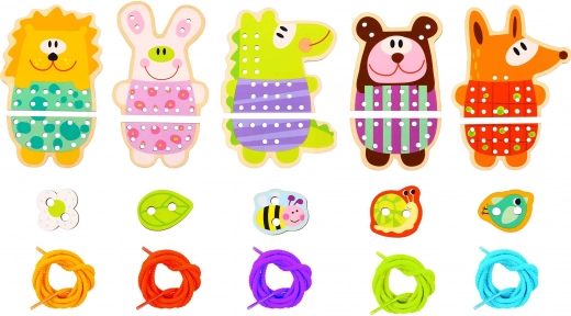 Découvrez l’ensemble ludique de petits animaux en bois à lacer 5 en 1 de TOOKY TOY, qui développe la motricité fine, la coordination œil-main et la créativité. Les enfants passent des lacets colorés à travers les trous et « cousent » de petites pièces au bon endroit – ils entraînent ainsi la concentration et la patience de manière amusante.