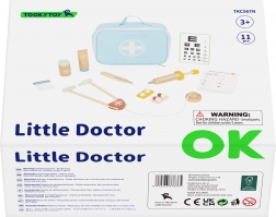 Le set comprend 11 pièces : valisette en tissu, stéthoscope, seringue, thermomètre, « médicaments », tube de pommade, flacon pour médicaments, paquet de cartes médicales, tableau optométrique et badge de médecin. Grâce au rangement clair dans la valisette, le set est idéal pour les voyages et se range facilement.
