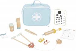 Stéthoscope, thermomètre, seringue, tableau optométrique et autres accessoires en bois de qualité favorisent un jeu sûr et imaginatif.