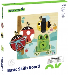 La planche d’activités en bois TOOKY TOY aide les enfants à exercer la motricité fine, la coordination œil–main et les compétences du quotidien. Les animaux colorés – l’abeille avec une boucle, la coccinelle avec lacet et la grenouille avec bouton – motivent à apprendre en jouant. Elle comprend aussi un jeu de tri, où les enfants placent les animaux au bon endroit.