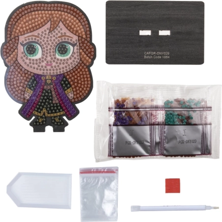 Contient une plaque en bois avec motif préimprimé, un stylo applicateur, un plateau, de la cire et des strass colorés.
