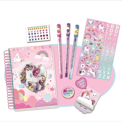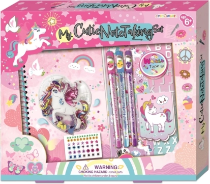 Coffret coloré Licorne : journal, stylos pailletés et autocollants pour enfants créatifs dès 6 ans.