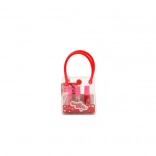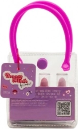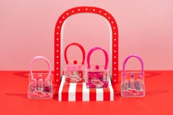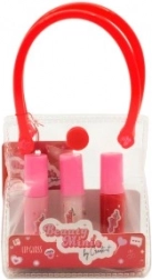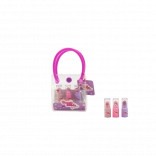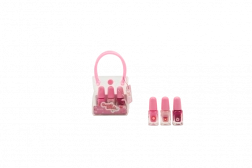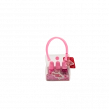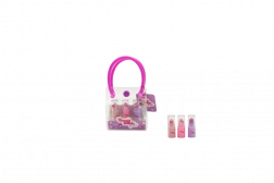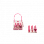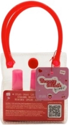 Adorable mini sac à main pour enfants rempli de maquillage pour petites coquettes. Choisissez parmi 4 ensembles différents selon le contenu : 3× vernis à ongles, 3× baume à lèvres, 3× gloss ou 3× rouge à lèvres. La trousse transparente compacte avec poignée est idéale pour les voyages, les cadeaux et le jeu de salon de beauté.