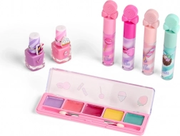 Palette de 5 fards à paupières avec applicateur, 4 gloss pour les lèvres, 2 vernis à ongles et 2 bagues – tout prêt à l’emploi.