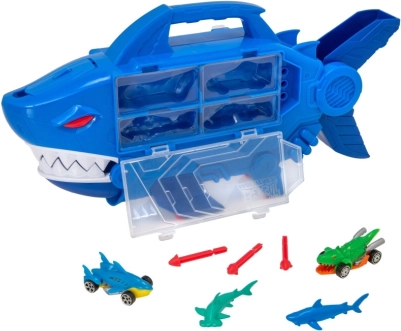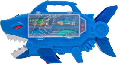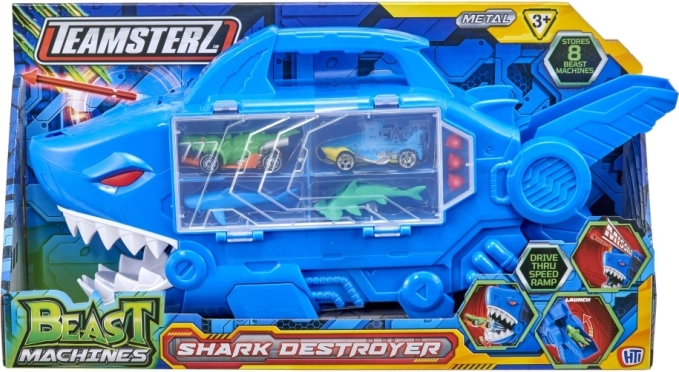 Le garage requin TEAMSTERZ combine jeu d’action, rangement et transport. À l’intérieur se cache une rampe drive-thru par laquelle les voitures filent directement à travers les mâchoires du requin. Le lance-projectiles intégré sur la tête du requin ajoute une bonne dose d’adrénaline à chaque course.
