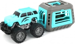 Un véhicule robuste aux grandes roues, parfait pour rouler sur le tapis comme sur les terrains irréguliers. La remorque avec cage se fixe et se détache facilement pour un jeu dynamique.