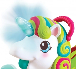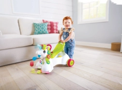 Le siège se relève facilement pour le mode marche et se rabat pour la conduite; un espace pour les balles se trouve sous le siège et à l’avant. La licorne sait ramasser les balles éparpillées et les relâcher au sol ou dans le panier. Les roues arrière offrent 2 réglages de vitesse pour les débutants comme pour les marcheurs plus assurés. La corne souple s’allume au toucher, motivant les enfants à interagir et à explorer.
