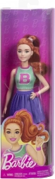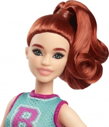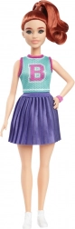 La poupée Barbie présentée a des cheveux roux en queue de cheval latérale et inspire l'exploration des tendances de la mode avec son look sportif-frais. Elle porte un t-shirt turquoise avec un grand 'B' et une adorable jupe plissée violette, complétés par des baskets blanches et un bracelet rose.