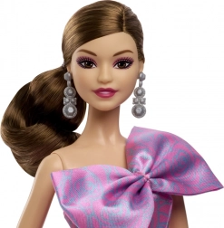 La poupée est habillée d'une magnifique robe avec une jupe rose et un haut violet à motifs, complétée par un grand nœud sur l'épaule.