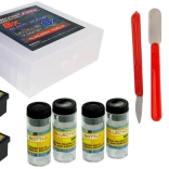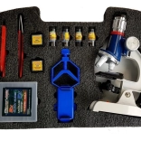 La boîte comprend des lames, une pince, un couteau, une spatule, une tige, des éprouvettes, une boîte et une lame préparée – tout le nécessaire pour les premières expériences au microscope.