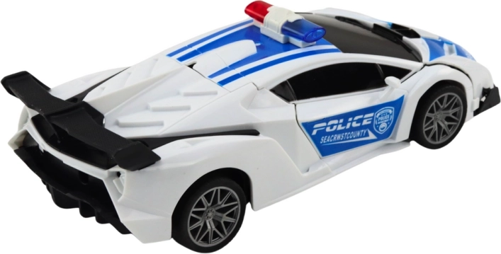 Cette élégante voiture de police blanc‑bleu ressemble à un véritable véhicule radio‑commandé – elle possède des gyrophares clignotants, des sons de sirène et peut transformer sa carrosserie en robot pendant la conduite, avec une calandre qui se soulève. Une fois la mission accomplie, elle redevient une voiture, permettant aux enfants d’alterner facilement entre deux modes de jeu.