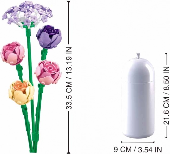 Le set est compatible avec LEGO, COBI et Mega Bloks, vous pouvez donc l’agrandir aisément avec d’autres éléments de votre collection. Grâce à des proportions réalistes, le bouquet final se distingue parfaitement dans un vase à la maison comme au bureau.