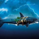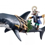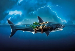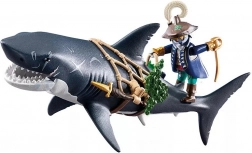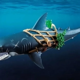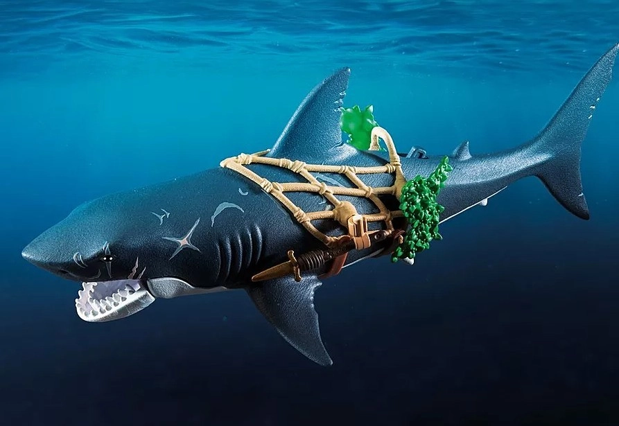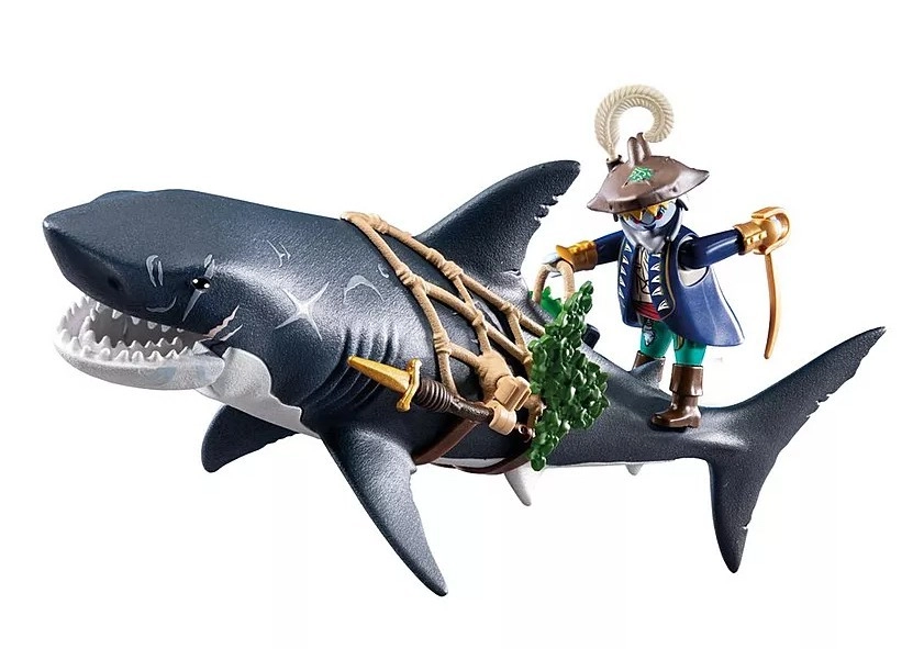 Le grand requin avec pirate de PLAYMOBIL apporte aux enfants des histoires palpitantes venues des profondeurs de l’océan. Il suffit de tirer sur le levier pour que l’énorme gueule s’ouvre, prête à « attraper » sa proie ; en le relâchant, elle se referme automatiquement. La figurine de pirate s’accroche au filet, est armée d’un sabre et de dagues, et est prête pour toute escarmouche maritime.