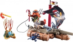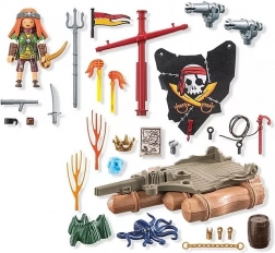 Partez pour une quête de trésors sans peur avec le radeau pirate de la gamme PLAYMOBIL ! Le radeau possède une baliste rotative et brille dans l’obscurité grâce à une tête en forme de crâne, parfait pour des duels navals épiques. Le pirate audacieux défend son butin en protégeant le crâne de cristal et la couronne à l’aide d’un canon, tout en échappant aux piranhas agressifs.