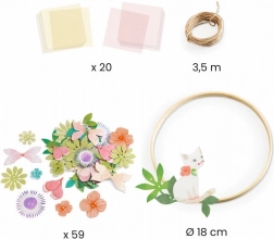 - 1 anneau en bambou (18 cm), 20 feuilles de papier de soie (2 nuances), 3,5 m de corde de raphia avec fil, 59 motifs illustrés prédécoupés et un ensemble d'instructions étape par étape.