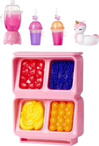 Contenu de la boîte : Petite sœur exclusive avec tenue, piscine avec toboggan arc‑en‑ciel, stand de smoothies avec mixeur, fruits et de nombreux accessoires. Convient aux enfants à partir de 3 ans.