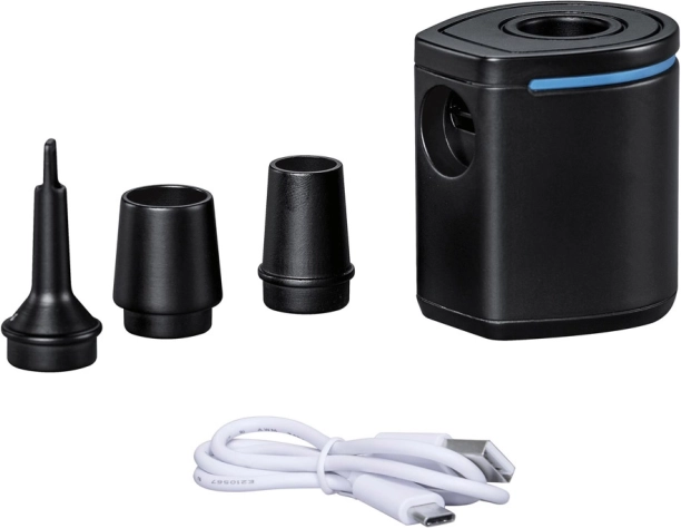 Grâce à son débit de 90 l/min, la pompe assure un gonflage et un dégonflage rapides. L’utilisation est intuitive – un seul bouton suffit. Avec trois embouts, elle s’adapte à la plupart des valves courantes des matelas gonflables, bouées, transats ou tapis de camping.