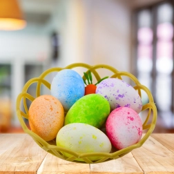 Ce magnifique ensemble de Pâques composé d'œufs colorés avec de subtiles taches et d'une carotte en plastique élégante placée dans un panier en plastique au design travaillé, est parfait pour créer une atmosphère printanière. Les œufs sont fabriqués en polystyrène léger et durable, tandis que le panier en plastique assure la stabilité et un entretien facile.