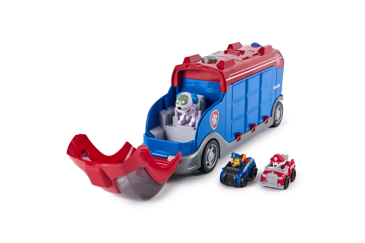 Le set comprend deux mini voitures de course des héros Chase et Marshall, ainsi que la figurine du Robo‑chiot avec son petit véhicule. Le transporteur possède des roues roulantes, une rampe pliante et un espace de rangement astucieux pour préparer facilement l’escouade.