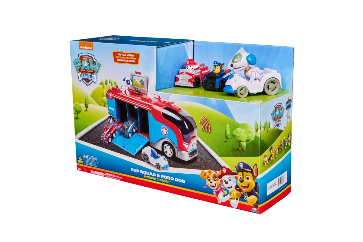 Partez en mission de secours avec l’emblématique transporteur PAW PATROL Mission Cruiser ! Inclus : les mini voitures de course de Chase et Marshall, la figurine du Robo‑chiot avec son petit véhicule, un moniteur rabattable avec carte de mission et des portières latérales à ressort. Appuyez sur le bouton sur le toit pour profiter des effets sonores authentiques de la série – un jouet idéal pour développer l’imagination et la motricité fine.