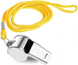Il est fabriqué en métal, assurant sa durabilité. Il contient une bille en plastique pour un son précis. Le pendentif en cordelette jaune permet un port confortable autour du cou.