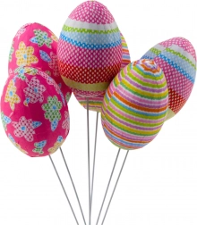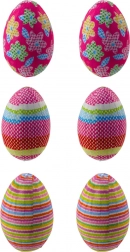 L'ensemble comprend des œufs avec des pois, rayures et motifs floraux pour une décoration de Pâques colorée.