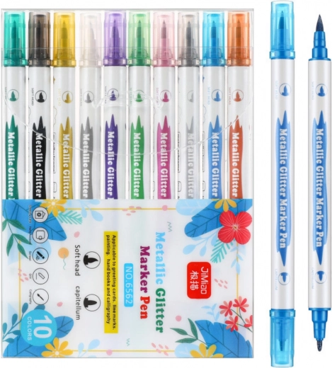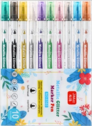 Illuminez vos créations avec un set de 10 feutres métalliques double pointe avec paillettes. Ils offrent un éclat métallique lumineux, deux largeurs de pointe (fine et large) et une encre non toxique à séchage rapide pour des lignes nettes sans bavures. Parfaits pour le papier, carton, plastique et céramique – pour le dessin, la calligraphie et la décoration.