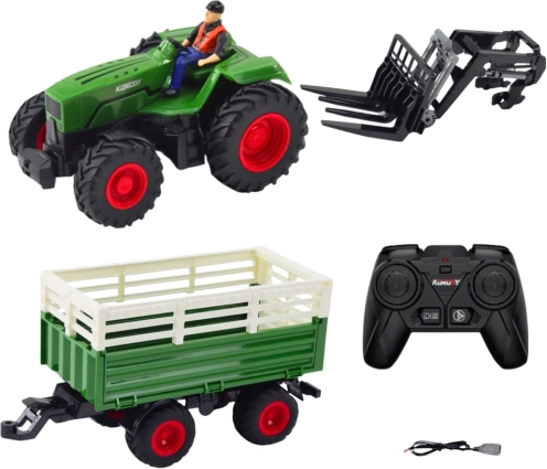 Un tracteur RC ludique et réaliste avec remorque et fourches, fonctionnant à la fréquence 2,4 GHz, ravira les jeunes passionnés de machines agricoles. Il offre un contrôle fluide, marche avant/arrière et direction, des effets lumineux et une construction robuste. La batterie rechargeable 3,7 V 500 mAh assure de longues heures de jeu, la charge se fait via USB.