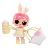 1 figurine (poupée ou animal), biberon, accessoires printaniers aux couleurs pastels, autres surprises