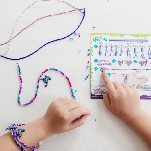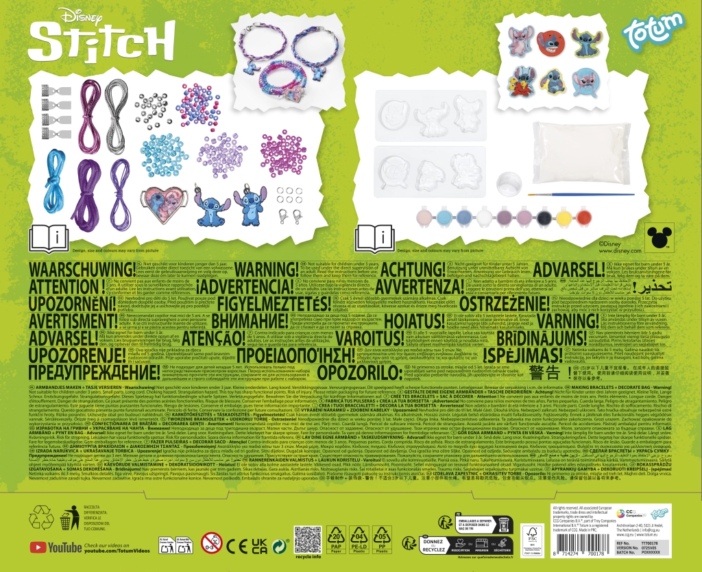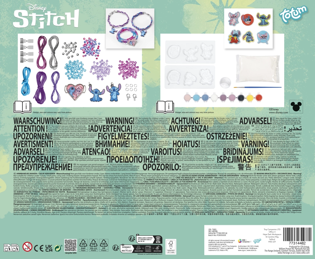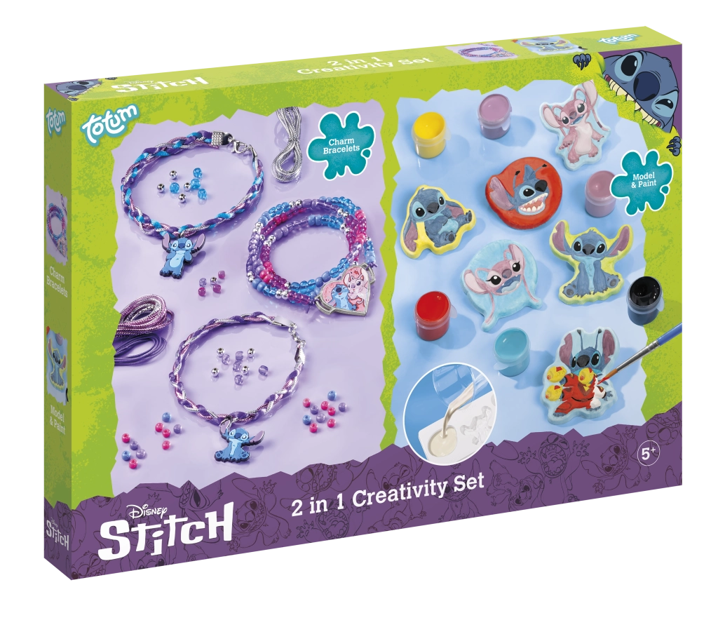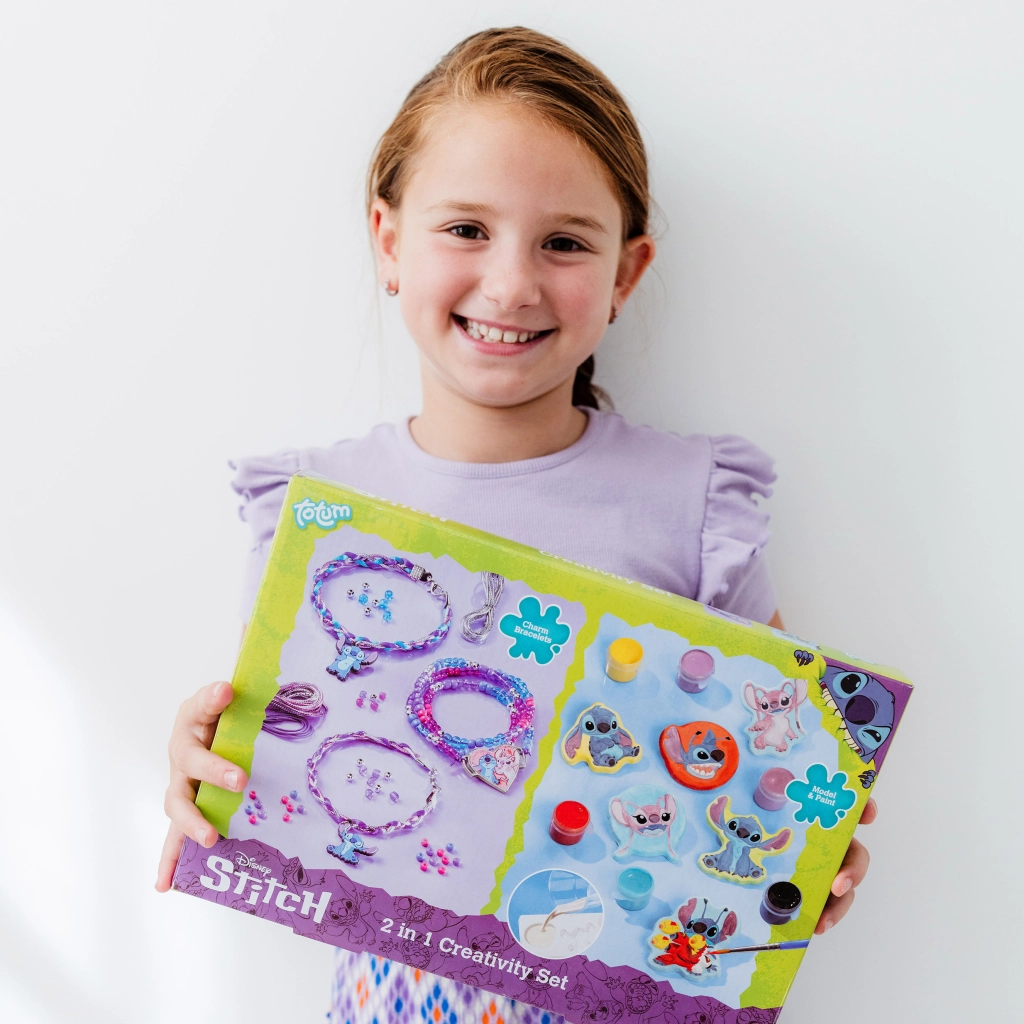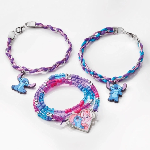 Ce coffret créatif polyvalent réunit deux activités populaires – la bijouterie fantaisie et la peinture. Les enfants fabriquent facilement jusqu’à trois bracelets : deux en cordons satinés aux couleurs vives et un bracelet de perles avec des perles en verre et à l’éclat métallique. Ils les décorent avec des breloques premium en caoutchouc à l’effigie de STITCH, ainsi qu’un grand pendentif en forme de cœur au motif STITCH et ANGEL.