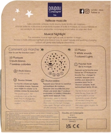 Cette boîte à musique avec projection est l’aide idéale pour l’endormissement des enfants. Le lapin est fabriqué dans une matière douce, parfaite pour les câlins, et son ventre cache un mécanisme musical avec projection de l’univers. Réglez le volume à l’aide de 4 boutons et choisissez parmi différents modes de lecture et schémas de couleurs.