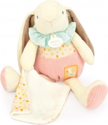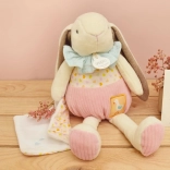 Un lapin aux longues oreilles souples et à la petite tenue en velours côtelé rose, conçu pour les tout-petits.