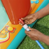 Le toboggan coloré est fixé au fond de la petite piscine pour une sécurité accrue et afin d’éviter tout déplacement pendant le jeu.