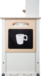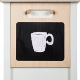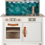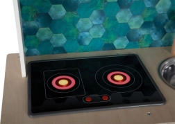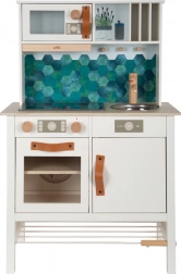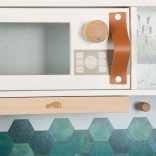 Les enfants apprécieront les nombreux accessoires: casserole avec couvercle, poêle et ustensiles de cuisine en métal. Le plat à four amovible sert aussi d’ardoise pour dessiner; le réfrigérateur et le four ont des surfaces intérieures imprimées pour encore plus d’amusement. Le panneau arrière est recto-verso – choisissez le motif de carreaux hexagonaux ou une surface blanche qui s’intègre à tous les intérieurs.