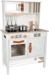 Une cuisine pour enfants élégante, blanche avec poignées couleur cognac, offre un jeu réaliste pour les petits chefs. Elle propose une plaque de cuisson électronique avec lumière et son, des boutons rotatifs à cliquetis, un évier en métal et de nombreux accessoires, dont une casserole, une poêle et des ustensiles en métal. S’y ajoutent une hotte rétractable avec symbole lumineux, un plat à four amovible utilisable comme ardoise et un panneau arrière recto-verso au motif carrelage moderne.