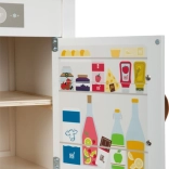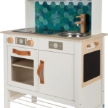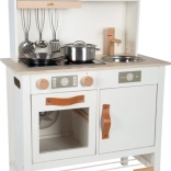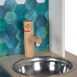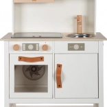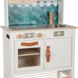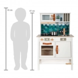 Cette cuisine en bois moderne SMALL FOOT Tasty se distingue par sa construction robuste, son look scandinave épuré et des fonctionnalités étudiées pour un jeu de cuisine réaliste. Elle comprend un évier en métal, des boutons rotatifs avec bruit mécanique, une plaque électronique avec effets lumineux et sonores et une hotte rétractable pratique avec symbole lumineux.