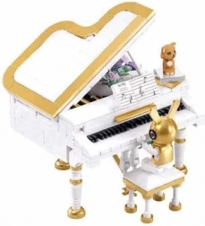 Un piano blanc détaillé avec accents dorés et décoration florale, accompagné d’une figurine stylée au clavier. Une superbe décoration pour une vitrine ou un bureau.