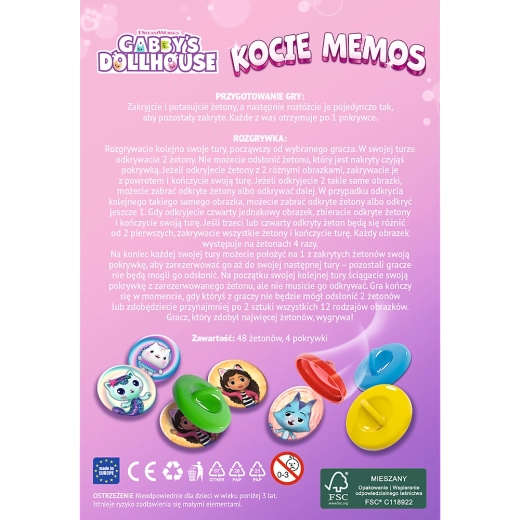 Le jeu familial amusant de memory Kocie Memos de la marque TREFL développe la mémoire, la concentration et apporte beaucoup de joie aux enfants comme aux adultes. Son format compact se glisse facilement en voyage – pour un pique-nique, des vacances ou chez les grands-parents. Cherchez les paires de jetons avec les personnages préférés du dessin animé La Maison de Gabby et collectez-en le plus possible !