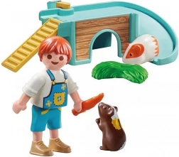 Découvrez l’univers des animaux de compagnie avec le set de jeu PLAYMOBIL, dans lequel un garçon prend soin avec amour de deux adorables cochons d’Inde. La maisonnette colorée pour rongeurs avec cachettes, escaliers et toboggan offre de nombreuses possibilités de jouer et d’inventer de nouvelles histoires. Des accessoires d’alimentation sont également inclus, notamment une carotte, une touffe d’herbe et un abreuvoir.