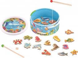 - Contient 22 pièces : poissons en bois et animaux marins, 2 cannes, « seau/étang » thématique.