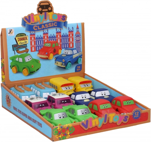 Voiturette en plastique souple 9 cm à roues libres. 6 variantes : Coccinelle, Trabant, voiture de sport, Mini, autobus, fourgonnette. Disponible aussi en présentoir de 12 pièces.