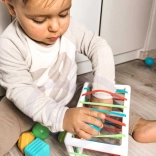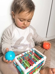 Le cube peut également être utilisé pour l’apprentissage des couleurs et des formes à un âge ultérieur. Les élastiques colorés du cube sont agréables pour l’enfant et facilitent l’insertion des objets. Ce produit indispensable est idéal pour les enfants à partir de 12 mois et aide à développer la motricité fine.