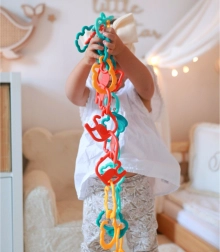 Grâce à leur forme pratique, les enfants relient rapidement les chaînons en chaînes, fixent les jouets et créent leurs propres assemblages colorés – un jeu créatif à la maison comme en déplacement.