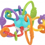 Ce jouet est sécurisé pour l’enfant, car il ne comporte pas d’arêtes vives et possède des parties souples pouvant servir d’anneau de dentition. Il favorise le développement du toucher, de la vue et de l’ouïe grâce au hochet qui capte l’attention. Les boucles flexibles permettent de faire glisser les éléments colorés, ce qui est excellent pour le développement de la motricité.